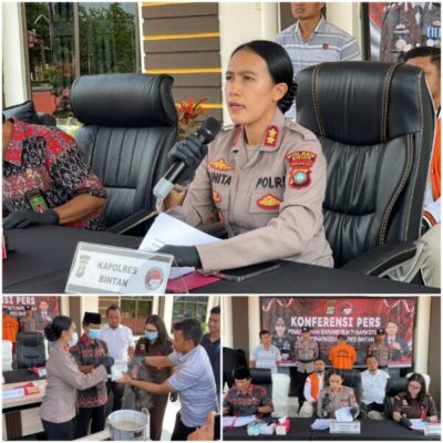 Kapolres Bintan AKBP Yunita Stevani, S.I.K., M.Si menyampaikan hari ini kita laksanakan Konferensi Pers kasus Tindak Pidana Narkotika dengan mengamankan 1 orang tersangka berinisial ME (30) yang berhasil diamanakan di Wisma Nusantara Kelurahan Kijang Kota Kecamatan Bintan Timur pada 7 mei 2025.