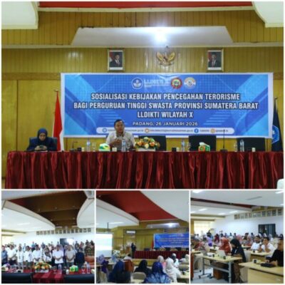 GBNnews.net–PADANG – Lembaga Layanan Pendidikan Tinggi (LLDIKTI) Wilayah X berkolaborasi dengan Densus 88 Anti Teror AT Polri menggelar sosialisasi pencegahan terorisme di perguruan tinggi, Senin (26/1/2026). Kegiatan berlangsung di Aula Lantai 3 LLDIKTI Wilayah X, Padang, diikuti perwakilan perguruan tinggi swasta se-Sumatera Barat.