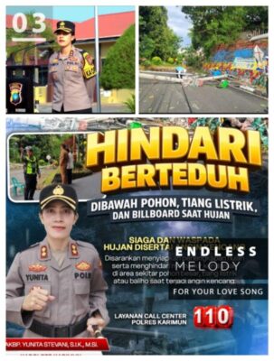Kapolres Karimun, AKBP Yunita Stevani, S.I.K., M.Si mengingatkan agar masyarakat tidak berteduh di bawah pohon besar, tiang listrik, maupun papan reklame (billboard) karena berisiko tinggi mengalami kecelakaan akibat tumbang atau tersambar petir.